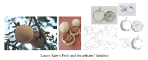 One highlighted motif was inspired by the kawis fruit (Limonia acidissima), a rare fruit iconic to Lasem. Its organic shape was transformed into flowing curves suitable for batik. The resulting Kawis Fruit Pagi Sore jarik (1 × 2 meters) features vine-like arrangements, “watu pecah/kricak” backgrounds, and kenikir flower accents.